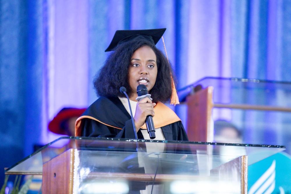 Micheline Nshuti Manzi , representing the graduating class, delivers her message at the ceremony on November 16. Photos by Emmanuel Dushimimana