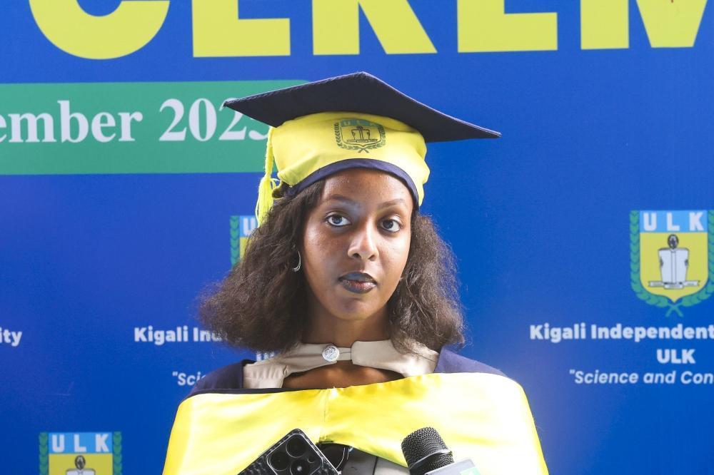 Claria Mutoni, a Finance graduate, at the 22nd Kigali Independent University and 9th ULK Polytechnic Institute graduation ceremony on December 12, 2025.