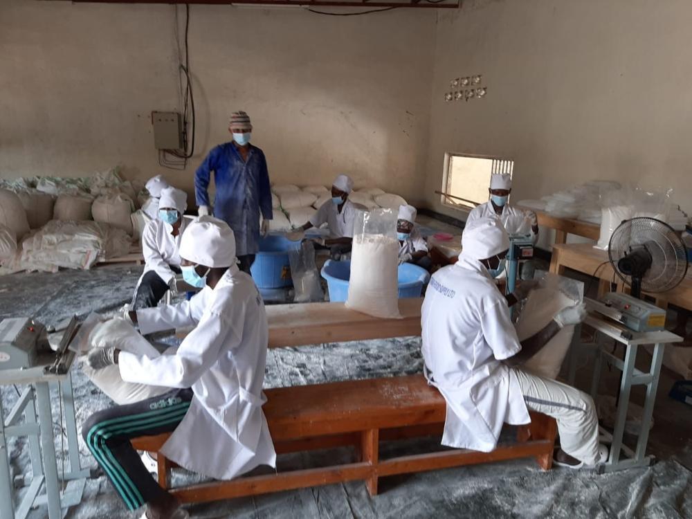 Some of Nyirasagamba’s workers packaging Nyamiyaga Akanoze cassava flour at the factory.