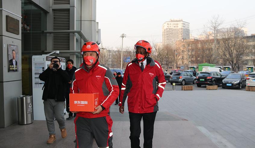 Clad in a delivery personnel’s outfit, the diplomat, along with workers of JD.com, a popular ecommerce company in China, visited the home of the client, delivered her order and signed a certificate of thanks to her, for supporting Rwandan products.