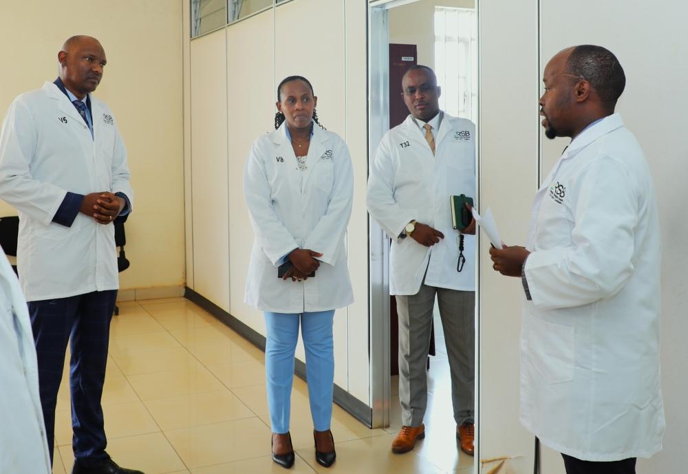 Deputy Director General at REMA Faustin Munyazikwiye (L), State Minister at the ministry of environment (c) Claudine Uwera during a guided tour of the newly launched centre of calibration laboratories. Courtesy