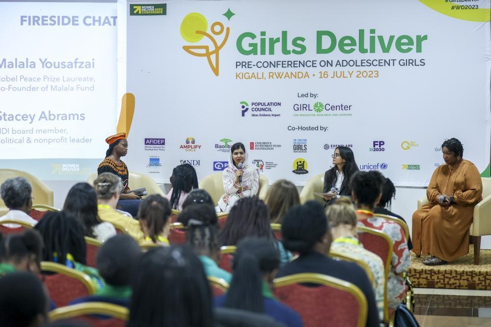 L-R: Condolizzarice Akumawah, Adolescent advocate from Cameroon, Malala Yousafzai, Nobel Peace Prize Laureate and Co-Founder of Malala Fund, Kalpa Garg, Adolescent leader from India and Stacey Abrams, NDI board member and political and nonprofit leader during a fireside chat at the Girls Deliver: Pre-Conference on Adolescent Girls. Photos by Olivier Mugwiza