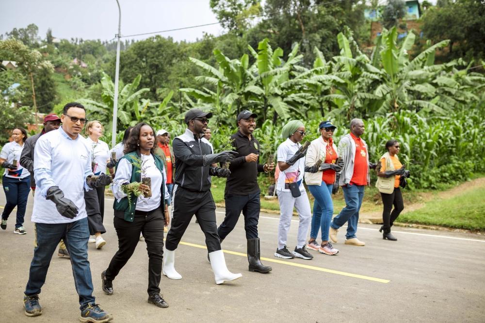 Minister of Trade & Industry, Mayor of Rubavu District, BRALIRWA Corporate Affairs Director, among other event participants carrying tree seedlings to plant during Umuganda
