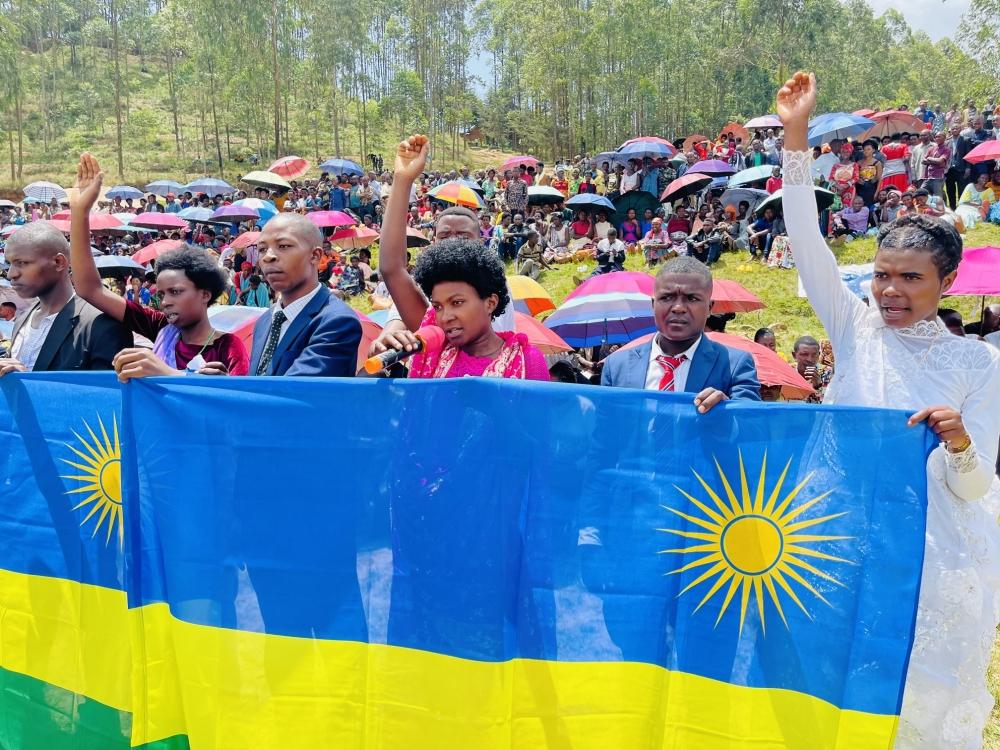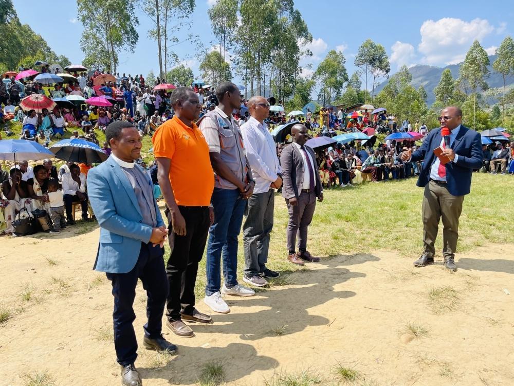 Gakenke District Mayor, Jean Marie Vianney Nizeyimana, commends staff members who were representing World Vision, for the organisation’s contribution to the legal marriage of the 390 spouses, March 8, 2023 (E. Ntirenganya)