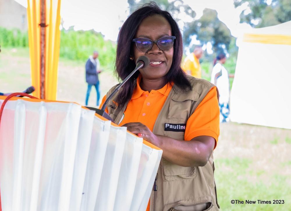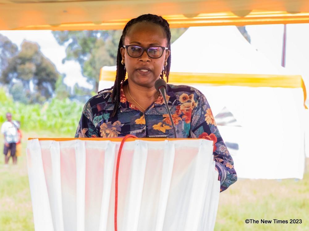 Pauline Okumu, the National Director at World Vision Rwanda addresses residents during the inauguration Musenda Integrated Early Childhood Development (ECD) Center in Burera District, on Wednesday, December 13. Craish Bahizi