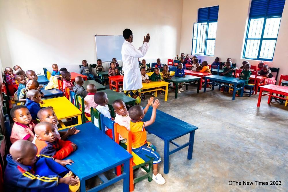 A caregiver train children at the newly inaugurated Musenda Integrated Early Childhood Development (ECD) Center in Burera District, on Wednesday, December 13