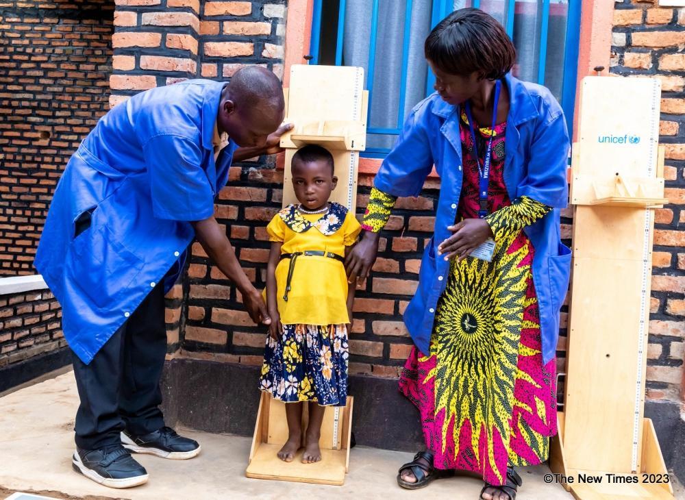 Community health workers take measures of a child to examine if she suffers from stunting.