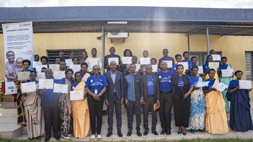 Officials pose for a group photo with some of 164 field agents, formerly community-based volunteers, who were certified and upgraded to ‘private service providers’ to improve the sustainability and scalability of the Savings and Internal Lending Communities (SILC) groups. All Photos by Emmanuel Dushimimana