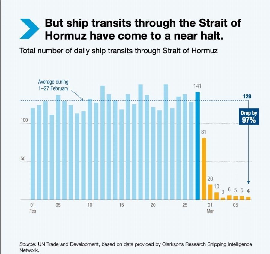 According to the same data, the total number of daily ship transits through the Strait of Hormuz dropped by 97 per cent from 129 to 4 by the end of February.