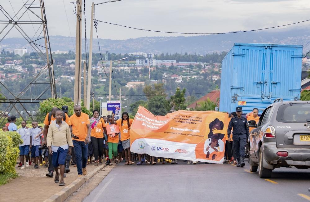 Africa-Press – Rwanda. In line with the 16 Days of Activism against Gender-Based Violence (GBV), an annual international campaign that kicked off on November 25 and runs until December 10, IGIRE Ubaka Ejo Activity funded by USAID, in collaboration with Gasabo District and other GBV actors in the district on December 7, 2023, conducted an anti-GBV mass campaign to raise awareness on GBV prevention — targeting the community around Gakiriro market.