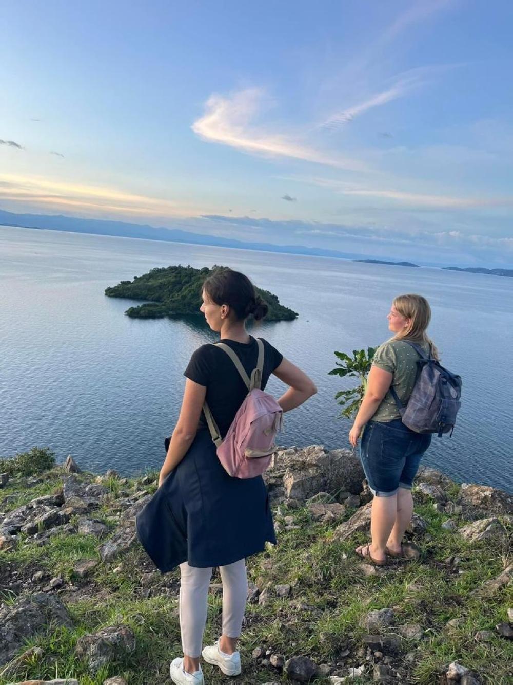 Tourists stand on the shore of Lake Kivu, one of the attractions in Rwanda.