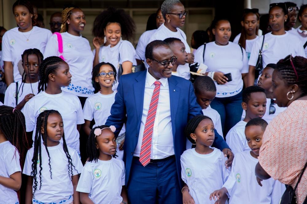 Minister of State in the Foreign Affairs Ministry, Manasseh Nshuti poses for a group photo with Rwandan youth and children from diaspora, in Kigali on July 25.
