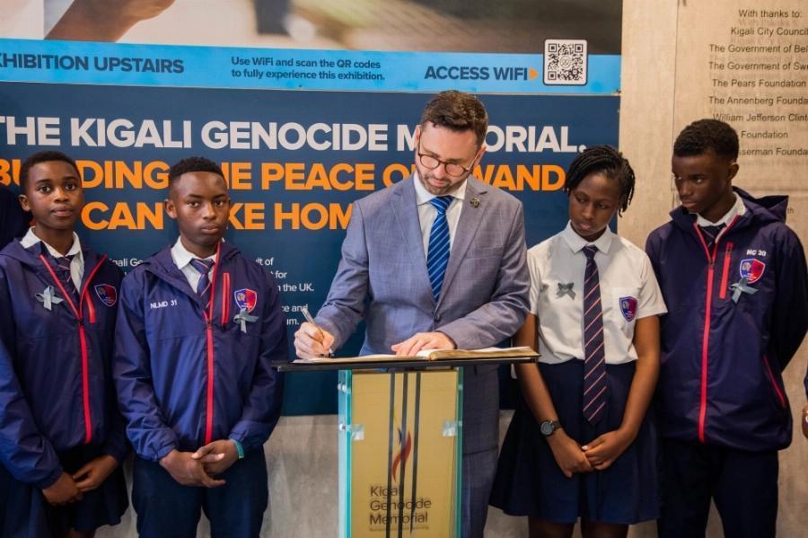The head of Ntare Louisenlund School, Damien Paul Vassallo, signs the guestbook at the Kigali Genocide Memorial.