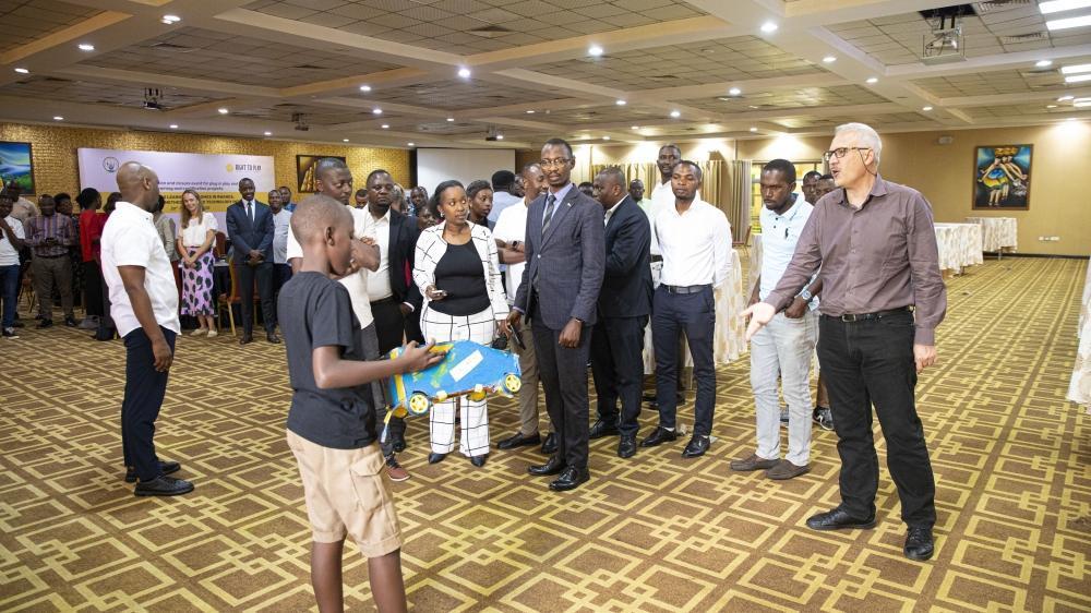 Logan Jean-Ganza, a Primary Six learner at Groupe Scolaire Bukomero in Ruhango District, presents to delegates a tracking system he designed to prevent uncontrolled vehicle crashes, during the event. Photo by Keza Kellya Raissa