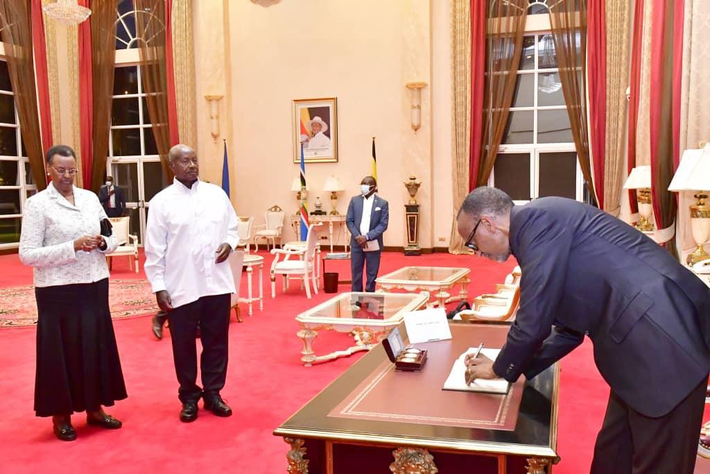 At State House Entebbe, President Kagame was welcomed by President Museveni and the First Lady, Mrs. Janet Kataaha Museveni before he signed a visitors book. It was President Kagame first visit to Uganda in four years.