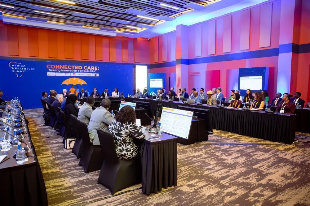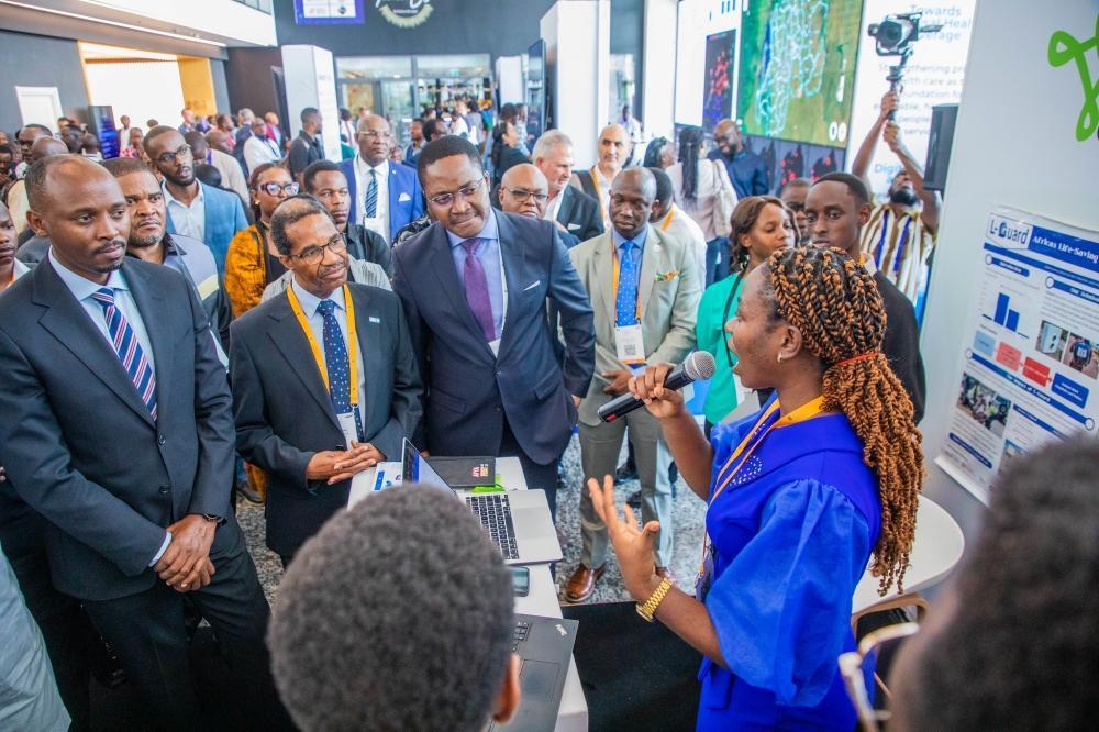 The Minister of Health, Dr. Sabin Nsanzimana, and other senior delegates tour a mini exhibition during the fourth edition of the Africa Health Tech Summit, held from October 13 to 15. Photo by Bahizi.