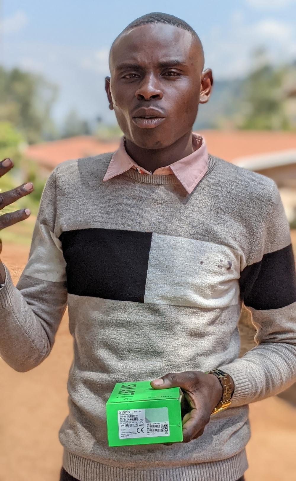 Théoneste Niyonambaza, who owns a pig farming business, with his new smartphone.