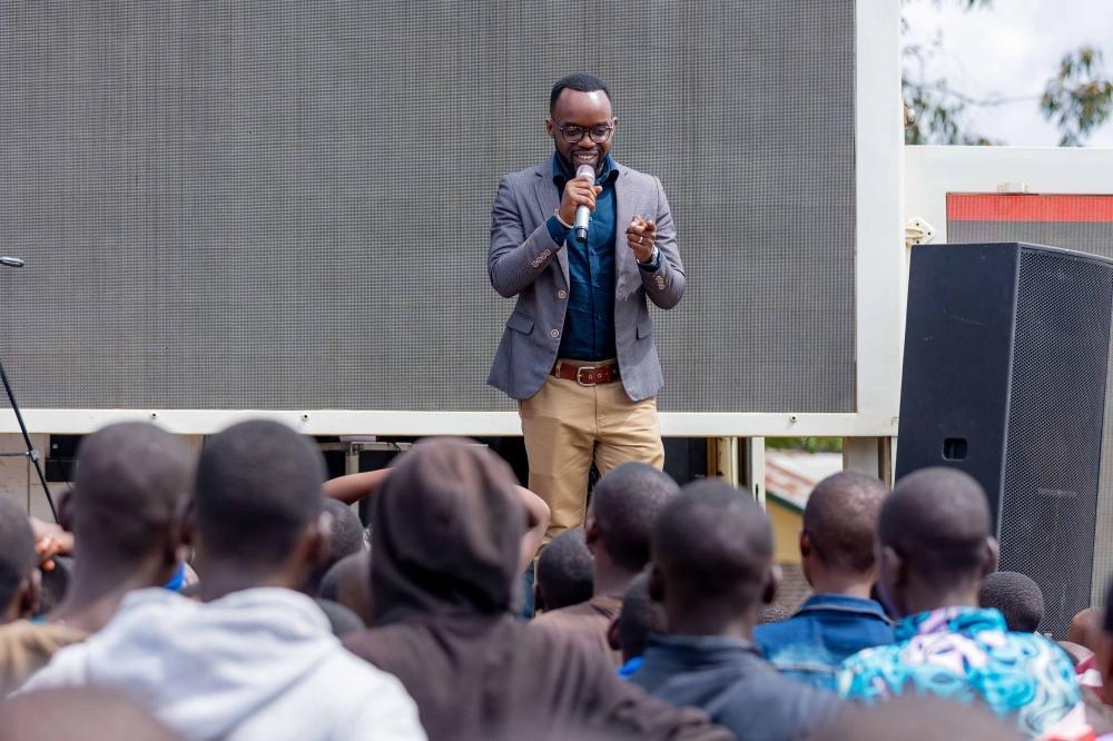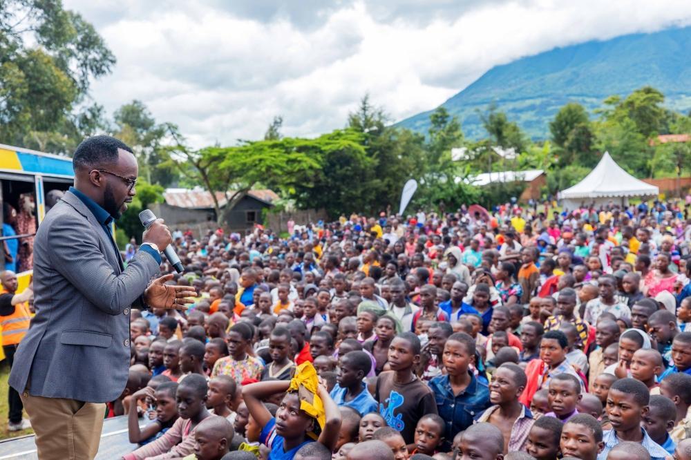 Isaie Micomyiza, the Country Manager of Ubongo addresses the event that brought together thousands of individuals from across the district, including children and parents, at the Kidaho pitch.