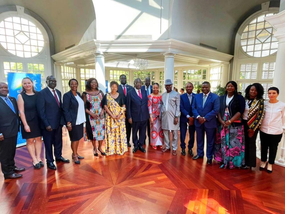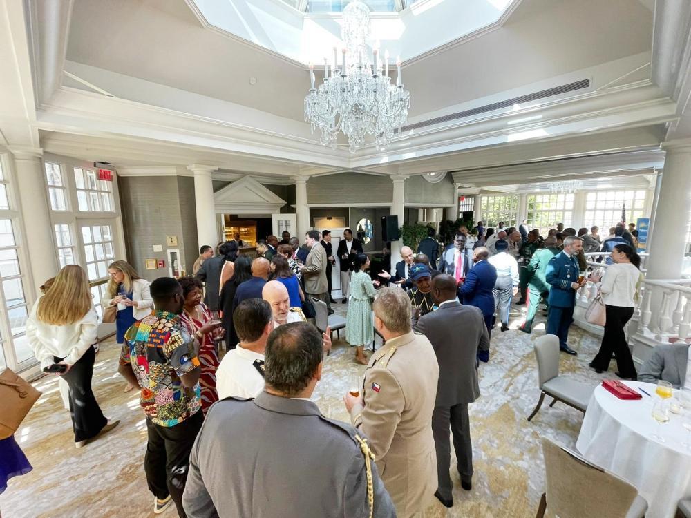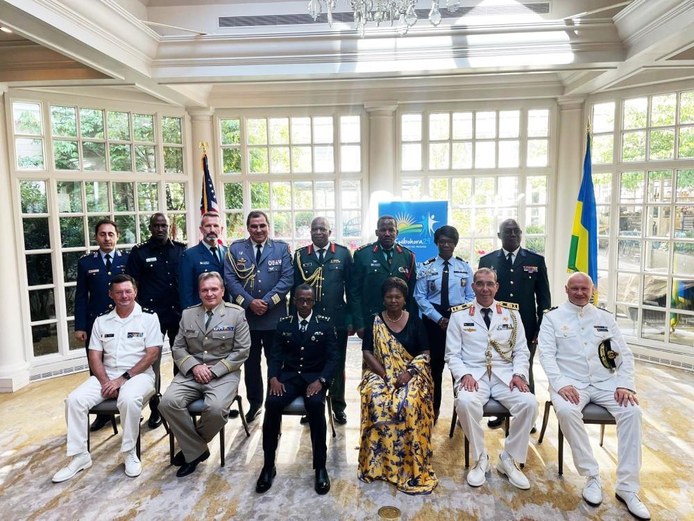 Ambassador Mathilde Mukantabana in a photo with Military Attachés who attended the celebration of the 29th Anniversary of the Liberation of Rwanda.