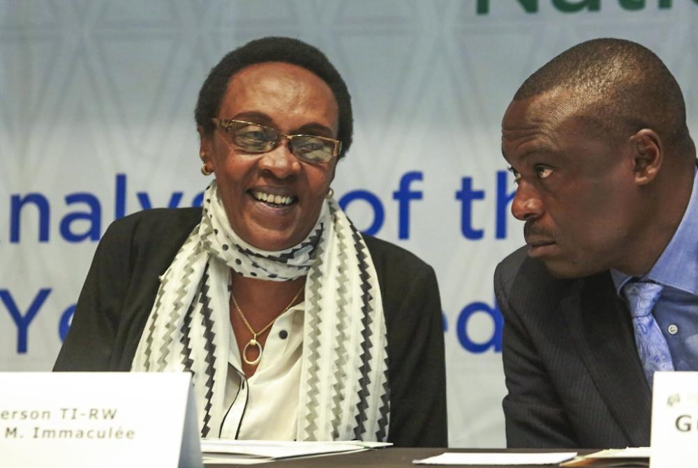 Ingabire interacts with Clement Musangabatware, former Deputy Ombudsman in charge of preventing and fighting corruption, during a meeting. Photo by Sam Ngendahimana