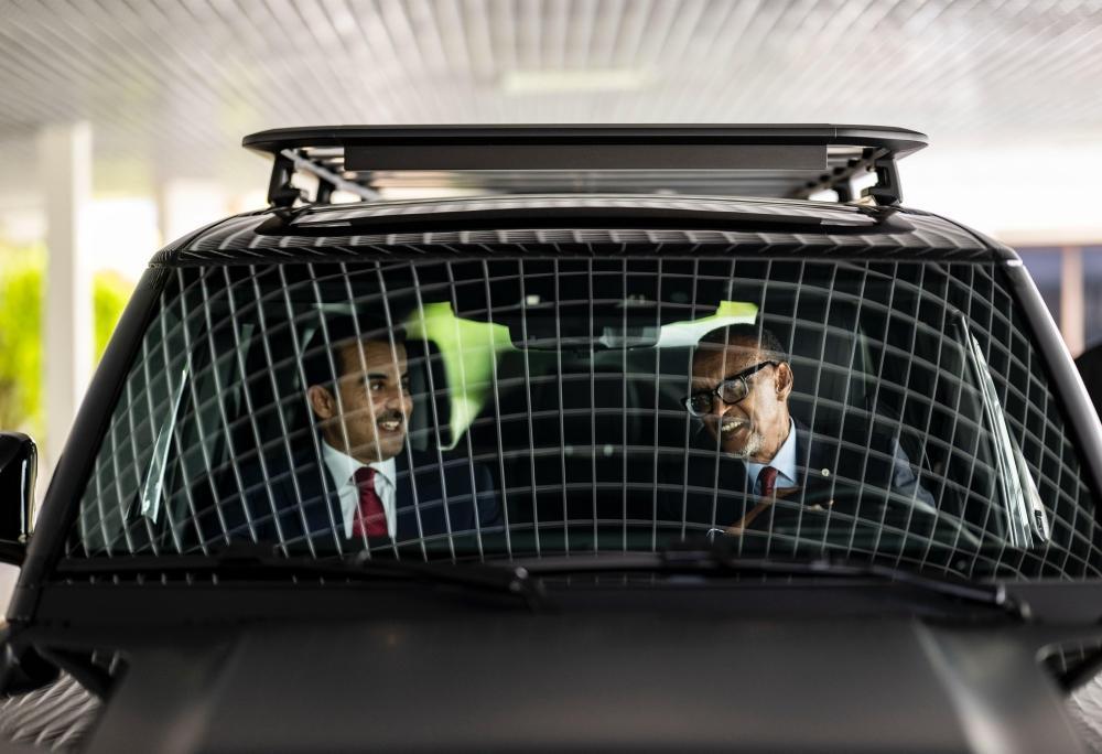 President Kagame and the Emir of Qatar share a ride as the latter began his two-day visit to Rwanda.