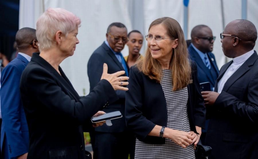 Minister of Gender and Family Promotion Consolee Uwimana and Chief Justice Domitilla Mukantaganzwa observe a moment of silence.