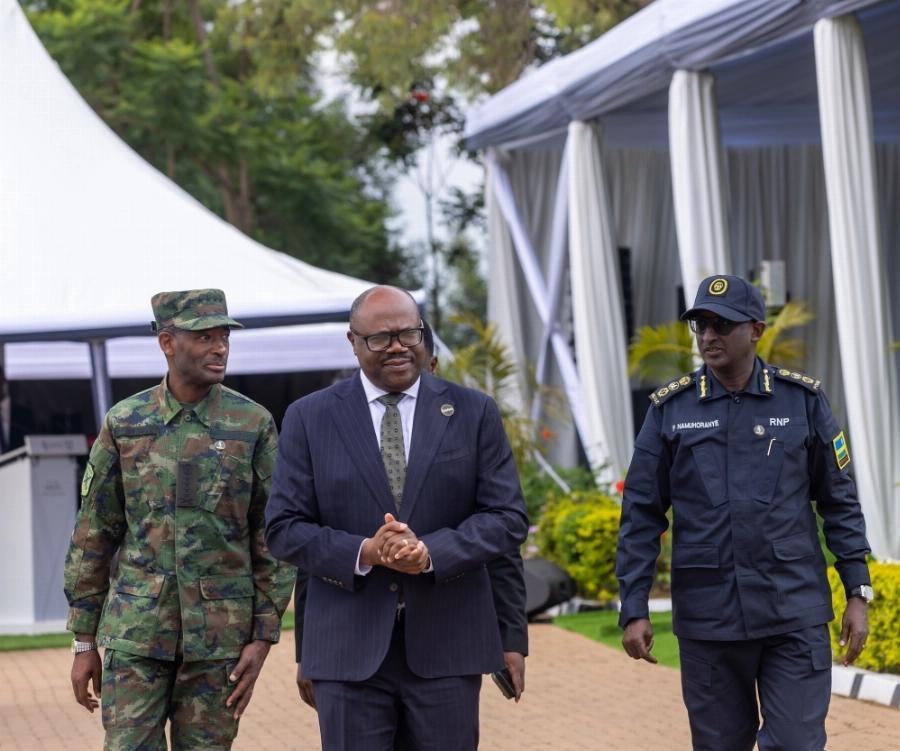 Aimable Havugiyaremye, the Secretary General of Rwanda’s National Intelligence and Security Service (NISS), Inspector General of Police CG Felix Namuhoranye and Rwanda Investigation Bureau Secretary General Col. (Rtd) Pacifique Kayigamba Kabanda, on their arrival at the event.
