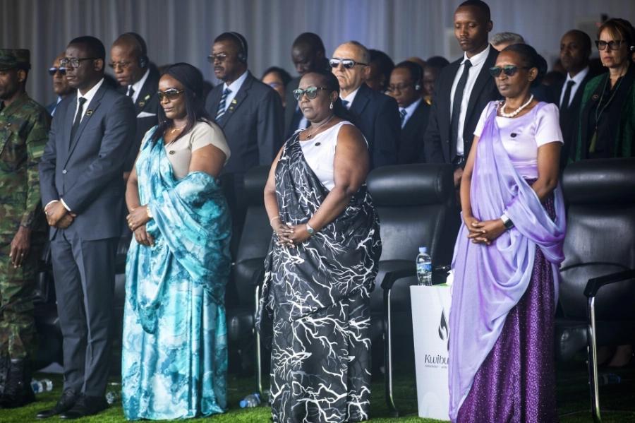 (L-R) Minister of Local Government Dominique Habimana, Minister of Gender Consolee Uwimana, Chief Justice Domitilla Mukantaganzwa and Speaker of the Chamber of Deputies Gertrude Kazarwa, observing a moment of silence to pay tribute to the victims.