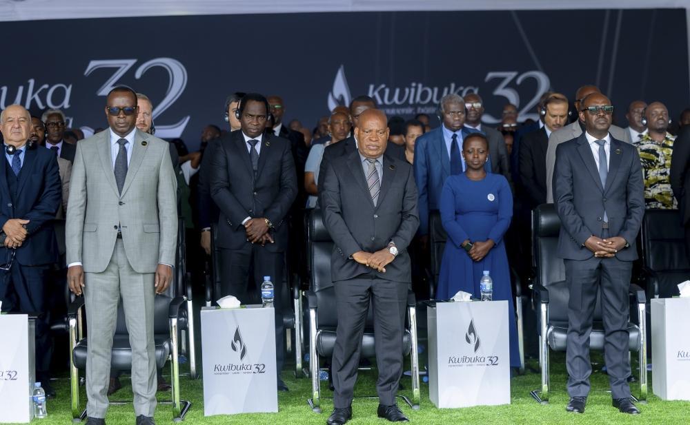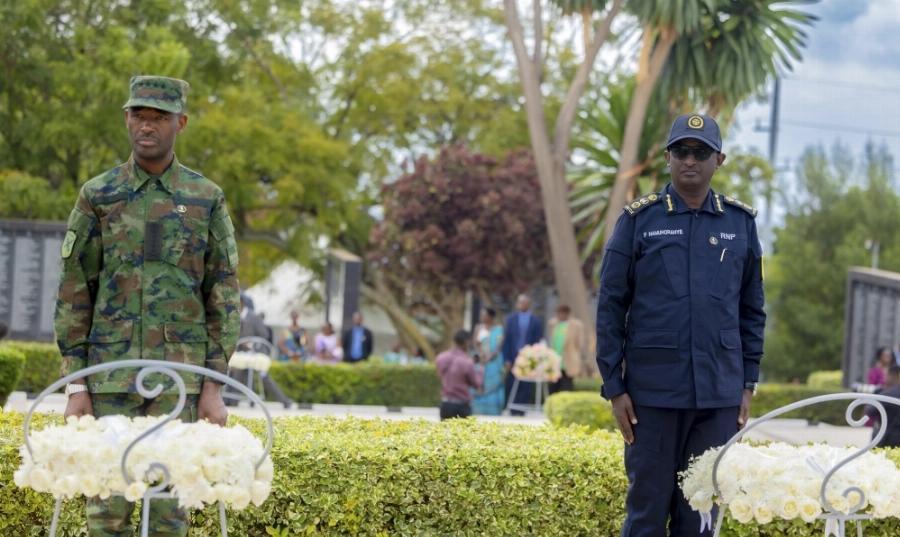 RDF Chief of Defence Staff Gen Mubarakh Muganga and the Inspector General of Police CG Felix Namuhoranye, and other mourners observe a moment of silence to honour the victims.