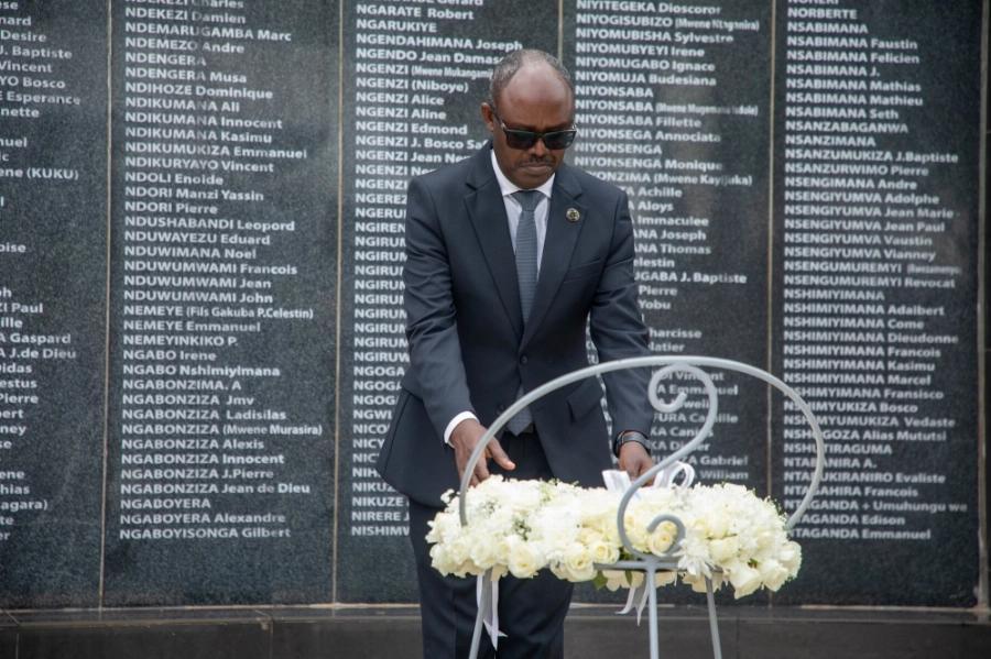 Philibert Gakwenzire, President of IBUKA, lays a wreath to pay tributes to victims of the Genocide against the Tutsi.