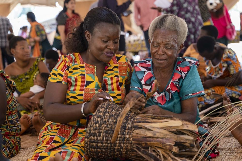 Musaniwabo’s colleague (R) teaches a visitor how to make a basket from banana fiber