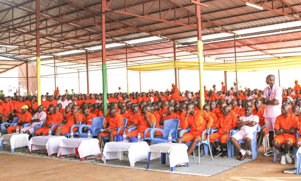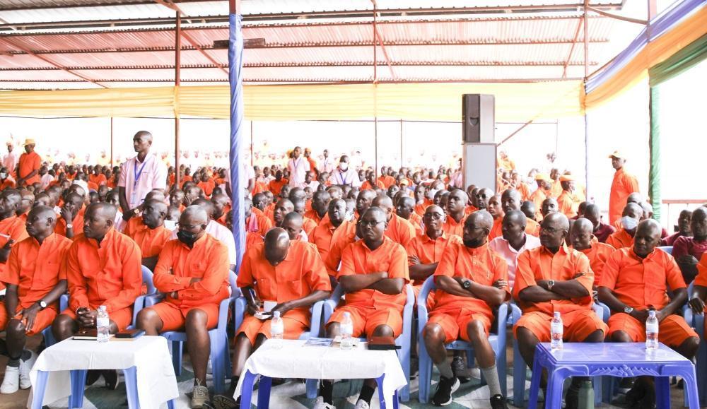 Inmates follow Chief Justice Domitilla Mukantaganzwa’s remarks while explaining the plea bargaining’s role in promoting restorative justice.
