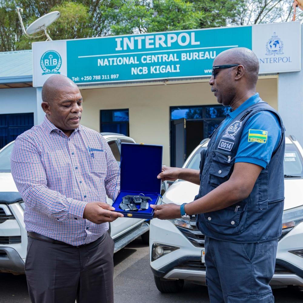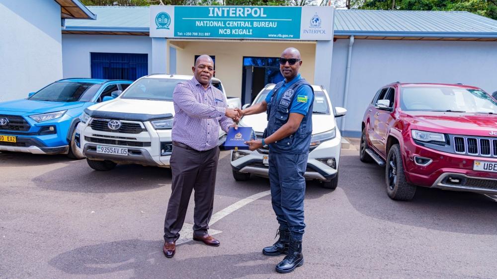 Rwanda Investigation Bureau’s Antoine Ngarambe, Head of the INTERPOL National Central Bureau Kigali and International Cooperation Department, hands over the stolen cars to the South African Police Service representative Lt. Col. Brian Butana Mashingo, Group Commander for International Vehicle Crime Investigations, in Kigali on Saturday, October 25. Courtesy