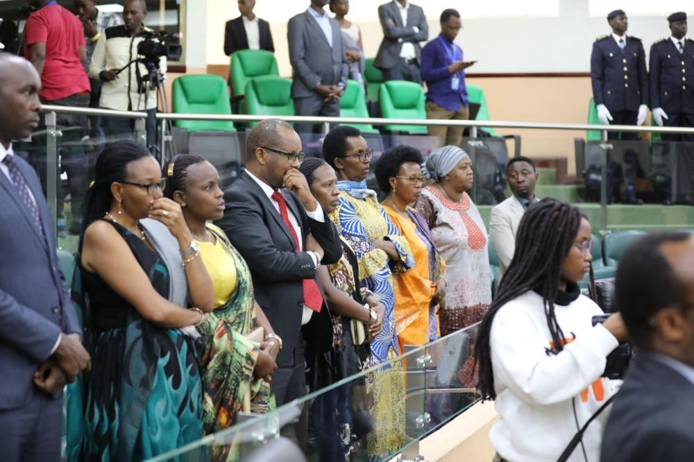 Mourners observe a moment of silence to pay tribute to Senator William Ntidendereza.