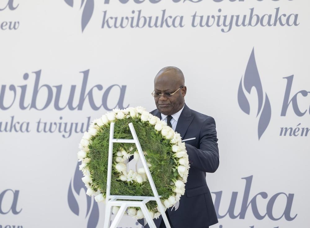 Ambassador of Congo Brazzaville , Guy Nestor Itoua who is also, the Dean of Diplomatic corps accredited to Rwanda lays a wreath to pay tribute to the victims.