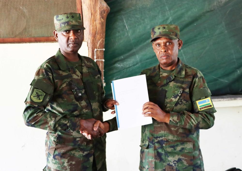 Outgoing Rwanda Security Forces’ Force Commander Maj. Gen. Eugene Nkubito handed over to new Force Commander Maj. Gen. Alex Kagame, while outgoing Task Force Battle Group commander Brig. Gen. Frank Mutembe handed over to Col. Theodomile Bahizi.