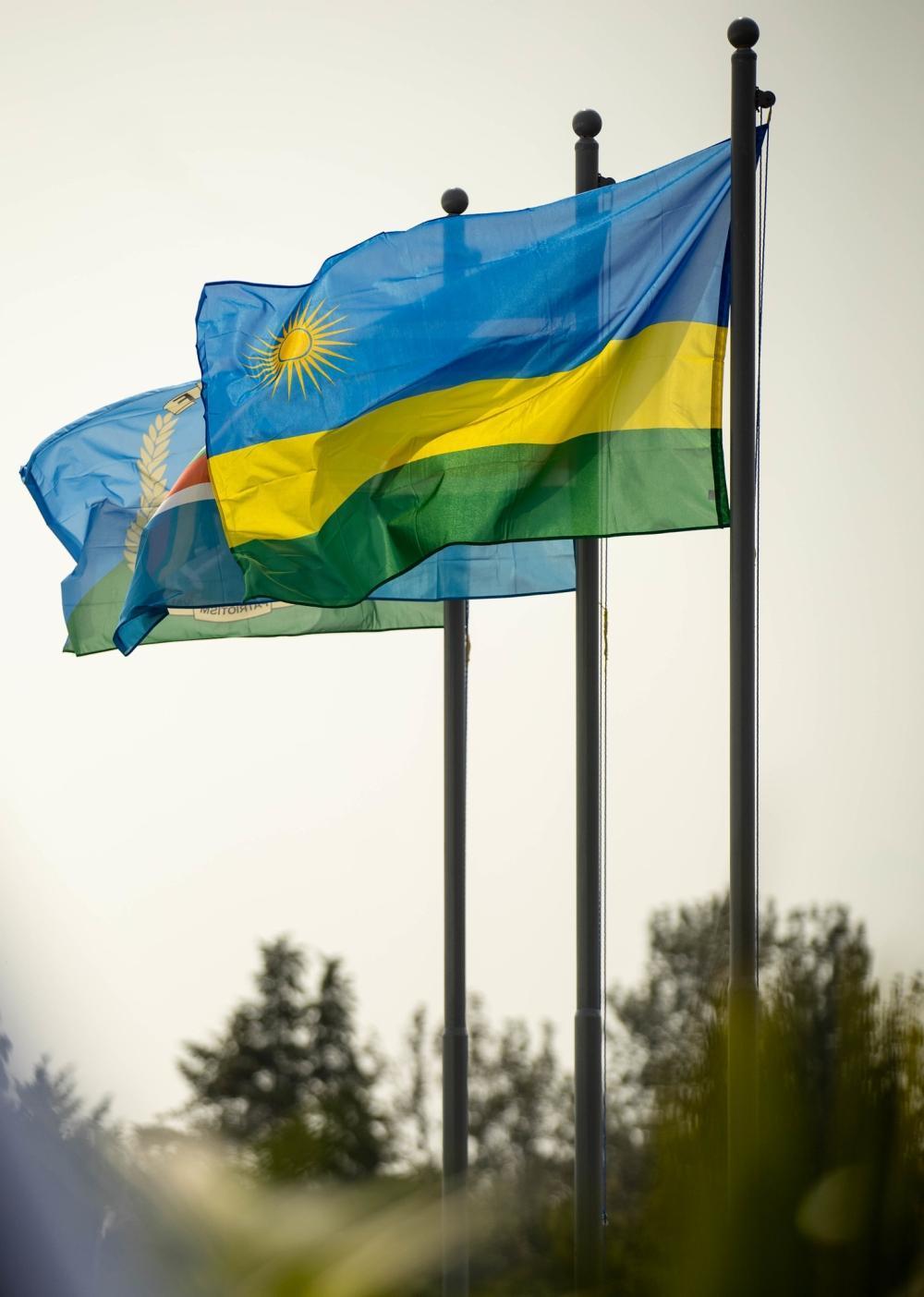 Flag bearers lead a military parade at the ceremony in Bugesera District