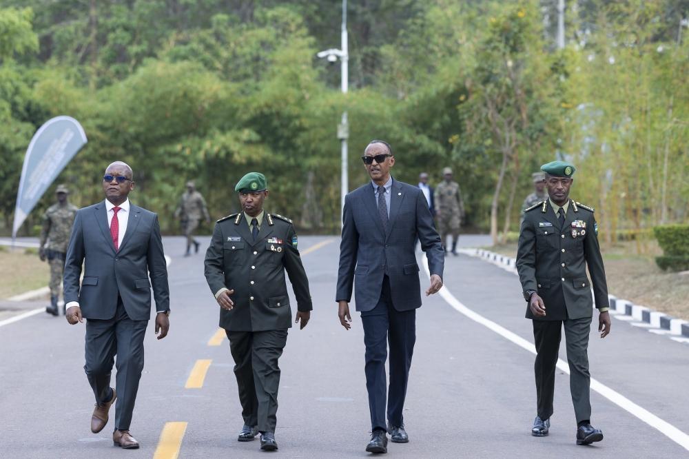 President Kagame, Defence Minister Juvenal Marizamunda (L) Brig Gen Franco Rutagengwa, Deputy Commandant of the Rwanda Military Academy, and Rwanda Defence Force Chief of Defence Staff, Gen Mubarakh Muganga (R)