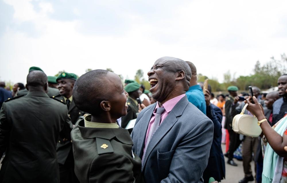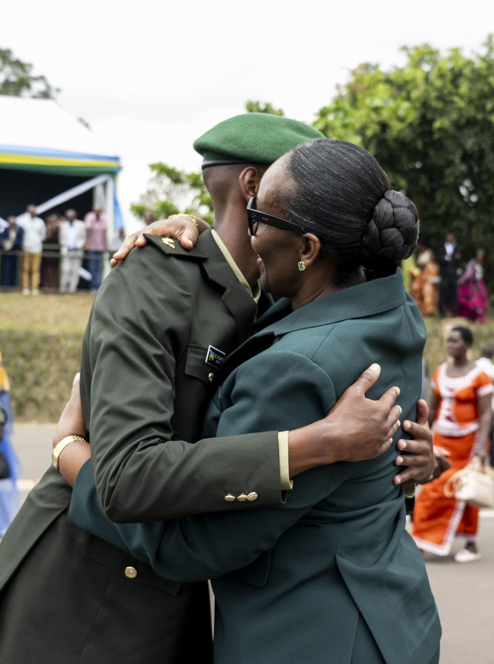 A parent celebrates with one of the newly commissioned Rwanda Defence Force officers during their passing-out ceremony in Bugesera District