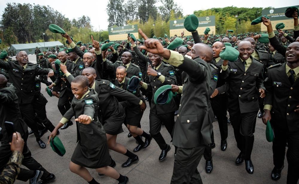 Newly commissioned Rwanda Defence Force officers celebrate during their passing-out ceremony in Bugesera District