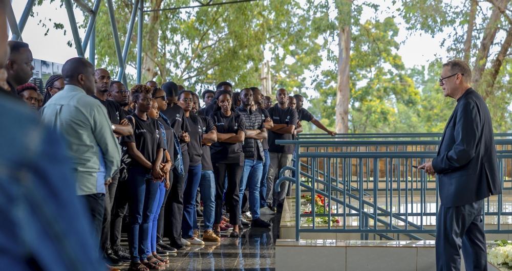Emmanuel Hamez, the CEO of Airtel Rwanda addresses mourners during their visit at Ntarama