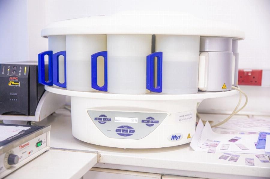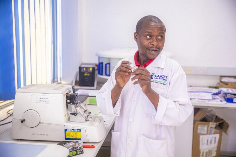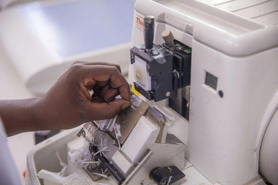 Lab technician at Cerba Lancet Rwanda operates a microtome, preparing precise tissue samples for analysis to support accurate medical diagnoses.