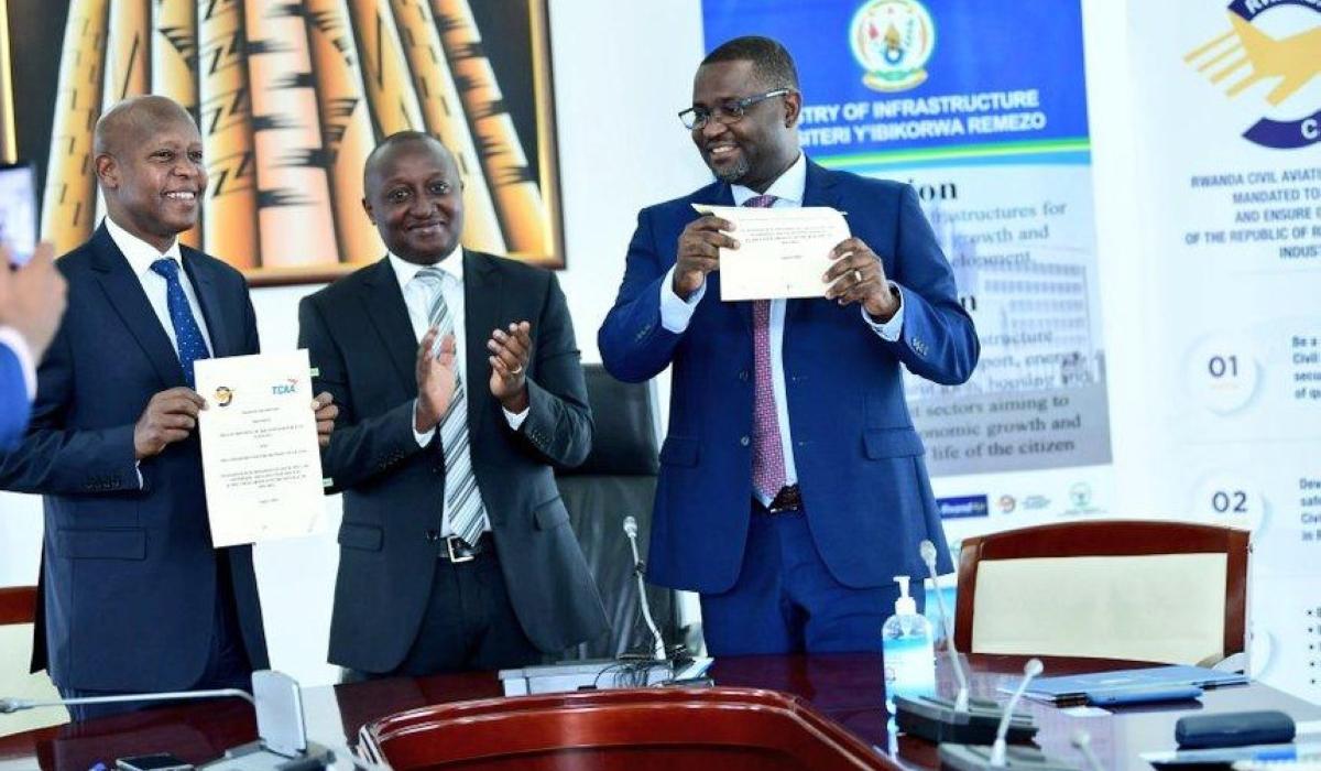 Silas Udahemuka, Director General of Rwanda Civil Aviation Authority (RCAA) and Tanzanian counterpart Hamza Johari, alongside Permanent Secretary at the Ministry of Infrastructure Fidèle Abimana as well as Barry Kashambo, Regional Director of ICAO Eastern and Southern African (ESAF), presided over the signing ceremony in Kigali.
