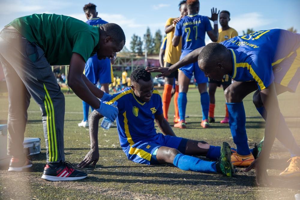 Amagaju’s Shyaka Peirre Celestin undergoes treatment after colliding with Vision FC ‘s goalkeeper Emmanuel Twagira was shown a straight red card in the 56 minute after hitting Shyaka on the head