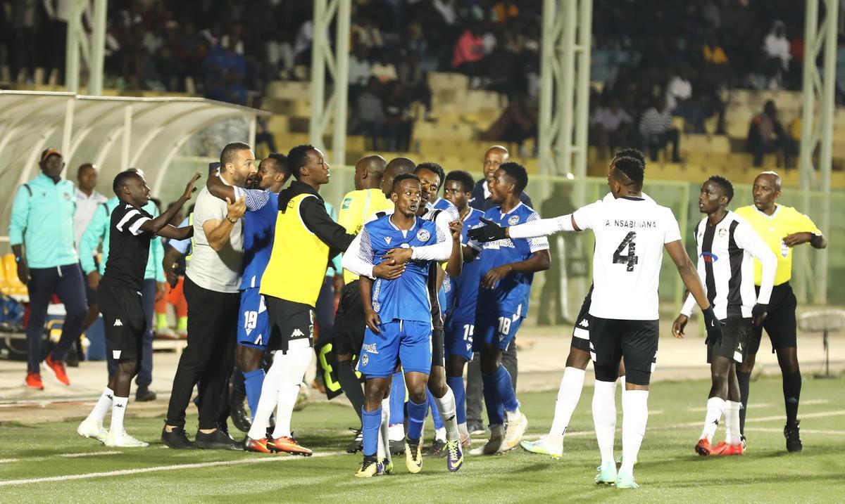 Referees try to calm down some tensions during the game.AS Kigali created more chances in the first half but attempts from Hussein Tchabalala, Aboubakar Lawal, Captain Haruna Niyonzima. Photo by Craish Bahizi