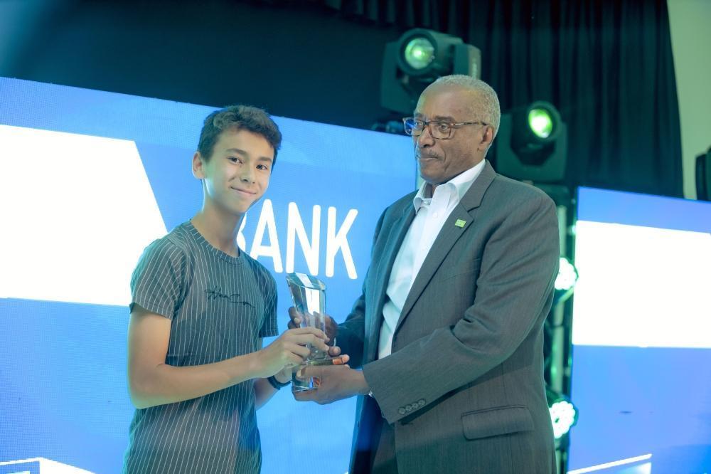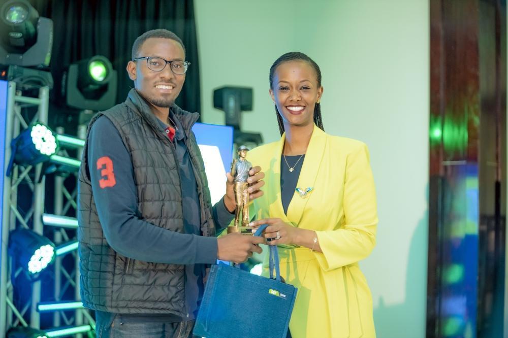 Mukisa Benjamin receiving his award from Patience Mutesi the BPR MD