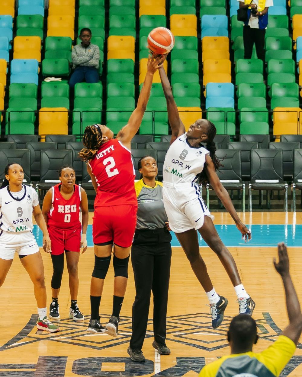 Betty Karanga from REG BBC vs Akon rose from APR in a battle for the ball