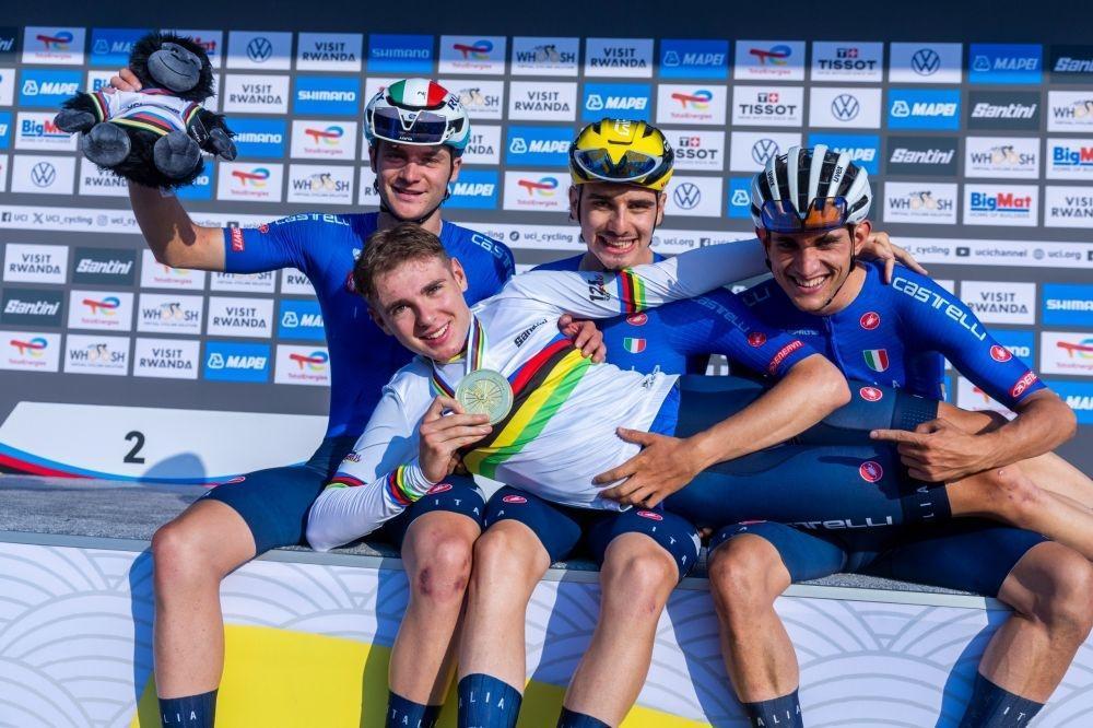 Italian rider Lorenzo Finn and his teammates celebrate as he claimed gold in the men’s Under-23 race at the UCI World Cycling Championships in Kigali on Friday, September 26, 2025.