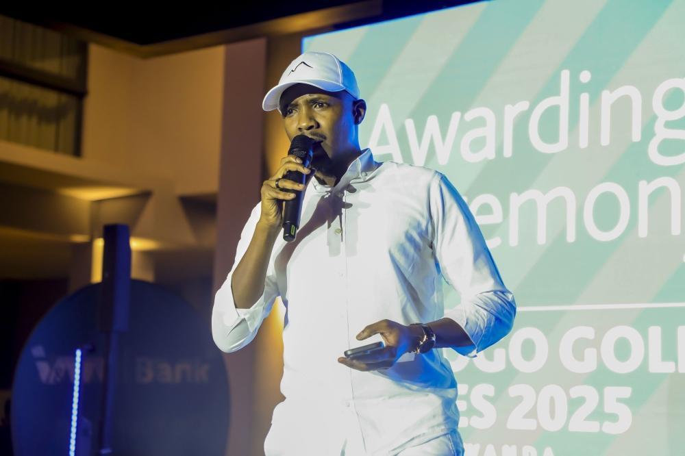 Iddy Rugamba, the Chief Corporate Affairs and Company Secretary, I&M Bank (Rwanda), speaks at the awarding ceremony.