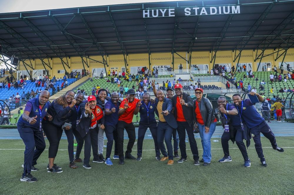 The winners pose for a photos as they enjoy a celebration dance after stunning the Rwandan side 2-0 at Huye Stadium on Sunday.